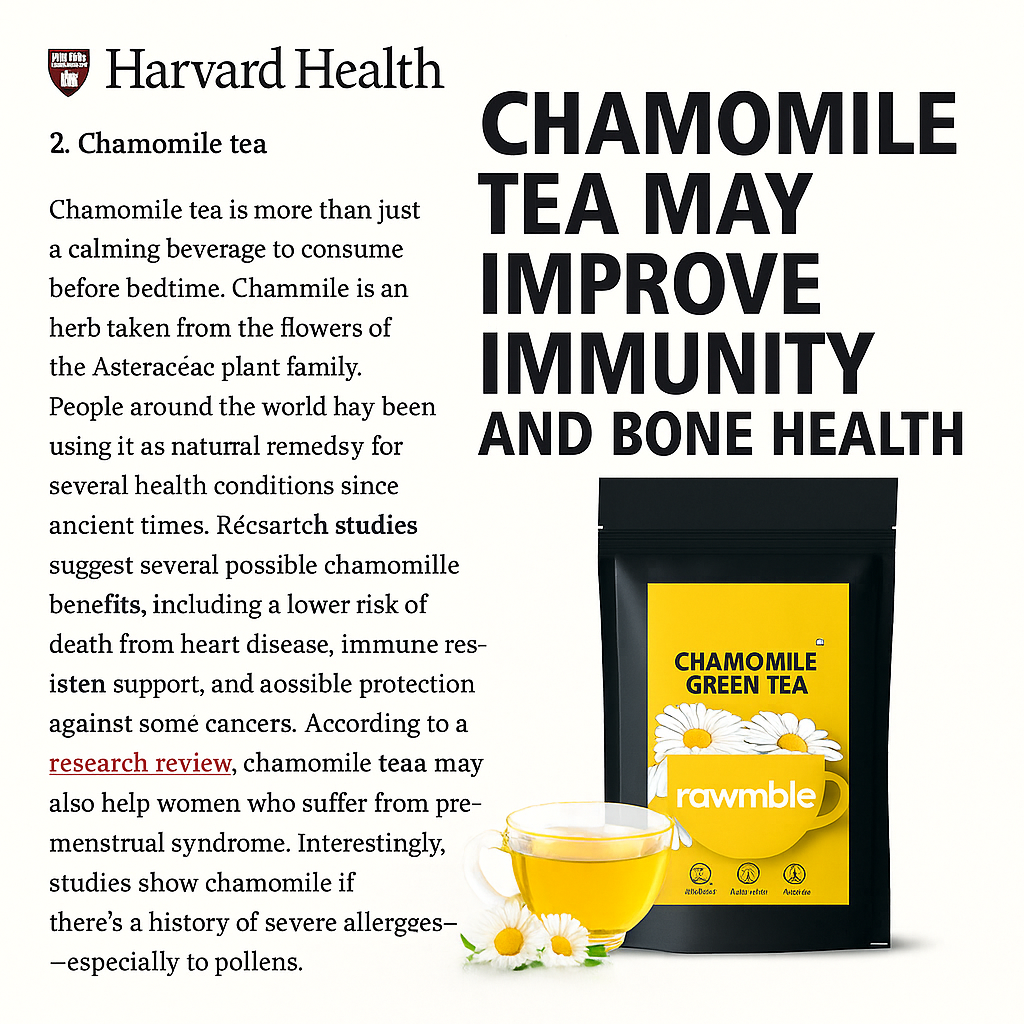 Chamomile contains phenolic compounds and flavonoids that exhibit antimicrobial & anti-inflammatory effects, strengthening the immune system.